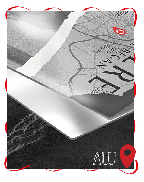 Optez pour le style MAP sur plaque aluminium pour célébrer l’endroit où tout a commencé. Ce support robuste met en valeur le lieu de rencontre avec précision et élégance, créant une pièce de décoration durable qui capture un moment important de votre histoire.